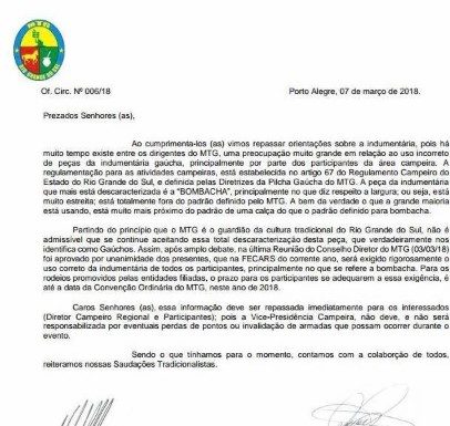 Saiu uma nota oficial do MTG, assinada pelo Presidente Nairo Callegaro junto ao Vice-Presidente Campeiro José Alvoni Araújo Silva, citando o uso INCORRETO da bombacha nos dias atuais, principalmente durante as provas campeiras.