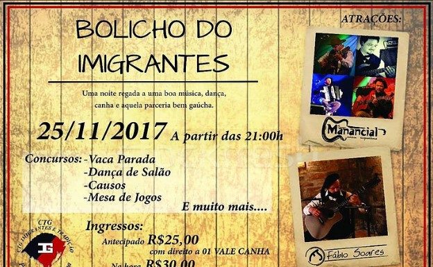 O CTG Imigrantes e Tradição, no dia 25, está organizando o seu BOLICHO, e contará com Show de Fábio Soares e baile com Grupo Manancial.